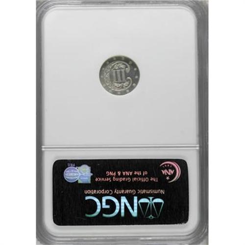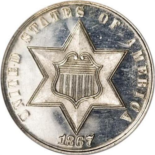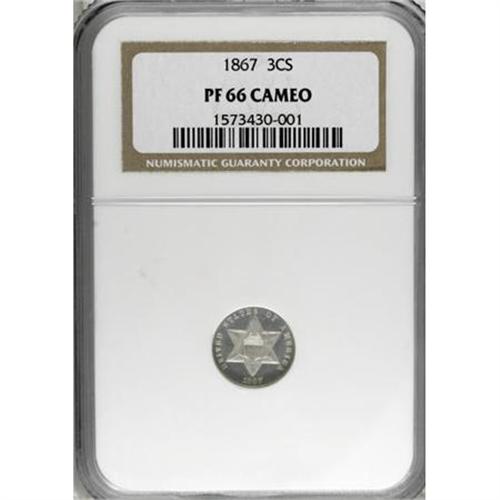 <B>1867 3CS PR66 Cameo NGC.</B></I> A total of 625 three cent silver proofs were struck in 1867. NGC and PCGS have certified numerous examples, but fewer that 50 pieces with the Cameo designation. Untoned surfaces of this Premium Gem Cameo display pronounced field-motif contrast, and are quite well preserved. A well executed strike bring out exquisite detail on the design features. Census: 6 in 66 Cameo, 4 finer (6/07).<BR><BR><b>Shipping:</b> Coins & Currency (<a target="_blank" href="http://www.heritageauctions.com/common/shipping.php">view shipping information</a>\)
