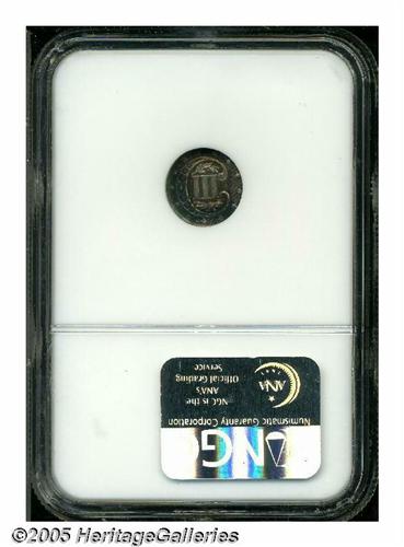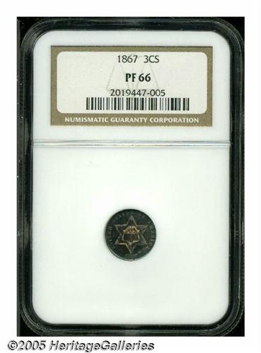 <B>1867<3CS> PR66 NGC.</B></I> Waves of sea-green and tobacco-brown patina endow this needle-sharp and spectacularly preserved premium Gem. A low mintage Type Three trime, just 625 proofs were struck in addition to only 4,000 commercial pieces. Population: 22 in 66, 9 finer (4/05).
