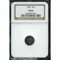 <B>1867<3CS> PR66 NGC.</B></I> Waves of sea-green and tobacco-brown patina endow this needle-sharp and spectacularly preserved premium Gem. A low mintage Type Three trime, just 625 proofs were struck in addition to only 4,000 commercial pieces. Population: 20 in 66, 9 finer (8/04). <BR><BR><B>Important notice:</B> Heritage usually auctions material at the rate of 200-250 lots per hour. On some occasions eBay Live bid software or the Internet may not be able to keep up with the pace of the auction. We recommend placing a realistic absentee bid now as insurance to avoid disappointment. Occasionally the auctioneer may eliminate or reject an eBay Live bid, and the auctioneer may also reopen a lot after the close of the eBay live bidding (usually because we missed an audience bid), and may reject your bid even if it shows you as the winning bidder. By bidding via eBay Live, you agree that Heritage may award the lot to another bidder at its sole discretion under the circumstances described above or any other reasonable circumstances. Since eBay bids are not shown to us until we open the lot on the floor, we treat those bids just like floor bids. In most cases the floor responds before the eBay bid is presented to us, due to Internet lag time, so for consistency we have made it a policy that floor bids are always considered first over tie eBay live bids. Also please note that all Heritage lots purchased through eBay Live carry a 20% Buyer's Premium. Please make sure you read the Terms and Conditions before you bid.
