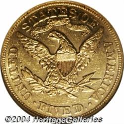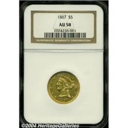 <B>1867<$5> AU58 NGC.</B></I> This is a very low mintage issue with a total production of just 6,920 coins. This was still a time of great hoarding of precious metals, with most being melted after production. The few that did circulate and eventually survive were not carefully preserved, and today have considerable wear or numerous problems. This lovely example has nearly full luster with outstanding surfaces. Population: 11 in 58, 1 finer (7/04). <BR><BR><B>Important notice:</B> Heritage usually auctions material at the rate of 200-250 lots per hour. On some occasions eBay Live bid software or the Internet may not be able to keep up with the pace of the auction. We recommend placing a realistic absentee bid now as insurance to avoid disappointment. Occasionally the auctioneer may eliminate or reject an eBay Live bid, and the auctioneer may also reopen a lot after the close of the eBay live bidding (usually because we missed an audience bid), and may reject your bid even if it shows you as the winning bidder. By bidding via eBay Live, you agree that Heritage may award the lot to another bidder at its sole discretion under the circumstances described above or any other reasonable circumstances. Since eBay bids are not shown to us until we open the lot on the floor, we treat those bids just like floor bids. In most cases the floor responds before the eBay bid is presented to us, due to Internet lag time, so for consistency we have made it a policy that floor bids are always considered first over tie eBay live bids. Also please note that all Heritage lots purchased through eBay Live carry a 20% Buyer's Premium. Please make sure you read the Terms and Conditions before you bid. </span></font></tr></table></td></tr></table>