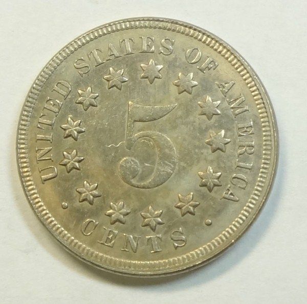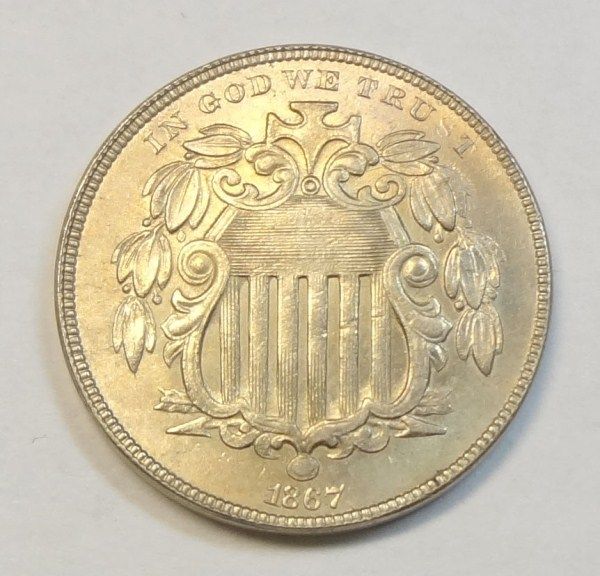 1867 5 cent Shield type no rays ChBu64 deeply lustrus & attractive hint of tone