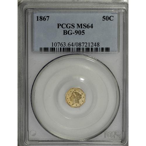 <B>1867 50C Liberty Octagonal 50 Cents, BG-905, Low R.5, MS64 PCGS.</B></I> Greenish-gold surfaces are well preserved, and the design elements exhibit a better-than-average strike for the issue. Parts of the 8 and the 7 in the dates are missing due to heavy repolishing, again that is typical for the reverses of this issue.<BR><BR><b>Shipping:</b> Coins & Currency (<a target="_blank" href="http://www.heritageauctions.com/common/shipping.php">view shipping information</a>)