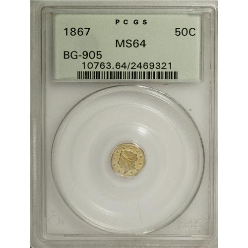 <B>1867 50C Liberty Octagonal 50 Cents, BG-905, Low R.5, MS64 PCGS.</B></I> PCGS Population (13/12). NGC Census: (2/4). (#10763)<BR><BR><b>Shipping:</b> Coins & Currency (<a target="_blank" href="http://www.heritageauctions.com/common/shipping.php">view shipping information</a>)