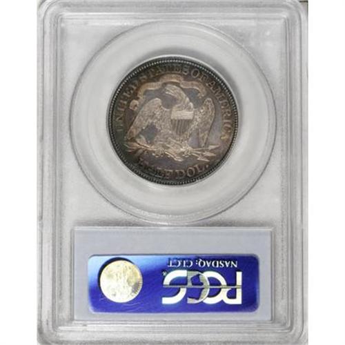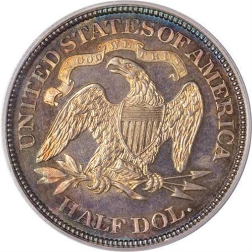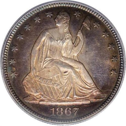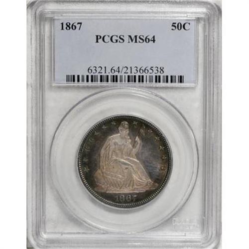 <B>1867 50C MS64 PCGS.</B></I> WB-101. Normal Date. Gorgeous, deep multicolored toning adorns each side of this visually alluring near-Gem. The design elements are sharply struck, and even the hair detail on the top of Liberty's head is crisply rendered. An abrasion on Liberty's upper chest and a few faint hairlines in the right obverse field limit the grade. Wiley and Bugert (1993) assigned this variety a Low R.6 rarity ranking, in Mint State, in their <I>Complete Guide to Liberty Seated Half Dollars</B></I>. Population: 10 in 64, 7 finer (7/07). <BR><BR><B>Coin Engraver:</B> Christian Gobrecht<BR><BR><b>Shipping:</b> Coins & Currency (<a target="_blank" href="http://www.heritageauctions.com/common/shipping.php">view shipping information</a>\)