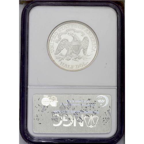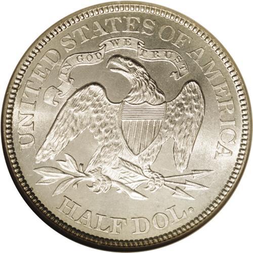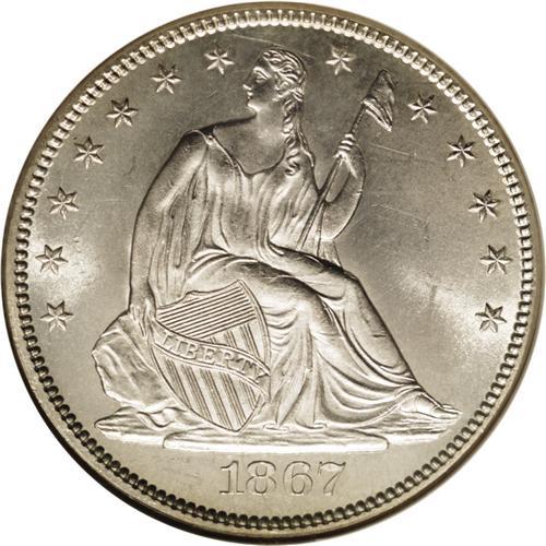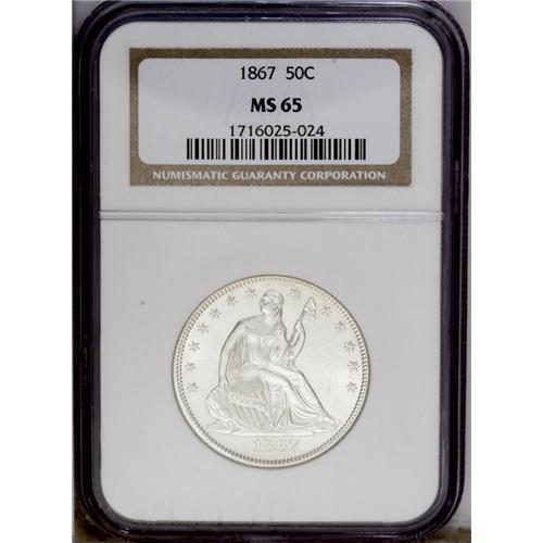 <B>1867<50C> MS65 NGC.</B></I> A snowy-white Gem that boasts strong luster and a bold strike. The surfaces are excellent for a coin of this period, with a few trivial nicks and scuffs, but none of the usual deep distractions that knock virtually all the survivors down and out of the Gem class. No so here, this sparkler retains abundant appeal and splendid surfaces. Note the tiny die mark on the left wing of the eagle, the second leaf from the top points to it. Perhaps the die was slightly damaged in this location. A very pleasing coin for the specialist. Census: 1 in 65, 0 finer (3/06). <BR><BR><B>Important notice:</B> Heritage usually auctions material at the rate of 200-250 lots per hour. On some occasions eBay Live bid software or the Internet may not be able to keep up with the pace of the auction. We recommend placing a realistic absentee bid now as insurance to avoid disappointment. Occasionally the auctioneer may eliminate or reject an eBay Live bid, and the auctioneer may also reopen a lot after the close of the eBay live bidding (usually because we missed an audience bid), and may reject your bid even if it shows you as the winning bidder. By bidding via eBay Live, you agree that Heritage may award the lot to another bidder at its sole discretion under the circumstances described above or any other reasonable circumstances. Since eBay bids are not shown to us until we open the lot on the floor, we treat those bids just like floor bids. In most cases the floor responds before the eBay bid is presented to us, due to Internet lag time, so for consistency we have made it a policy that floor bids are always considered first over tie eBay live bids. Also please note that all Heritage lots purchased through eBay Live carry a 20% Buyer's Premium. Please make sure you read the Terms and Conditions before you bid. This lot is being auctioned in conjunction with a live floor auction by Heritage Galleries & Auctioneers. All final auction and invoice information will be supplied by Heritage Galleries & Auctioneers, and all other information should be considered preliminary. Lot:2014 <BR><BR><B>Winning Notification and Billing:</B> After the FINAL session in this auction is complete, Heritage will send e-mail and snail mail invoices. This process normally takes several days. All final auction and invoice information will be supplied by Heritage Galleries & Auctioneers, and all other information should be considered preliminary. <BR><BR>This auction will be conducted on a live auction floor and over the Internet through eBay Live. If you choose to place an absentee bid, please take a moment to <font color='#0000ff'><u><a href='http://pages.ebay.com/liveauctions/help/before/laabsentee.html'>learn how eBay Live absentee bidding works</a></u></font><font color='#000000'>