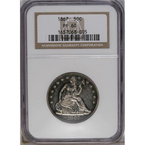 <B>1867<50C> PR60 NGC.</B></I> Scattered signs of contact over watery, moderately toned surfaces. Affordable quality for this second year With Motto proof issue.