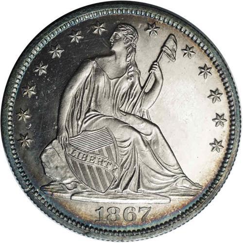 <B>1867<50C> PR62 NGC.</B></I> Thin bands of ice-blue and golden-brown color grace the obverse margin, and the reverse has similar but deeper toning. The Seated Liberty is nicely frosted, however, the reverse is sufficiently toned to deny Cameo status. Intricately struck and attractive. The right obverse field has a patch of vertical hairlines and a possible fingerprint fragment. Just 625 proofs were struck.
