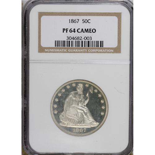 <B>1867 50C PR64 Cameo NGC.</B></I> About 300 proof 1876 half dollars have been certified by NGC and PCGS, out of a mintage of 625 pieces. About 50 examples have been assigned the Cameo designation. The current near-Gem Cameo exhibits dapples of milky color in the obverse fields, and the design features are exquisitely brought up. Some faint hairlines are noted on the obverse.<BR><BR><b>Shipping:</b> Coins & Currency (<a target="_blank" href="http://www.heritageauctions.com/common/shipping.php">view shipping information</a>)