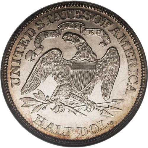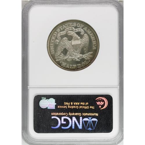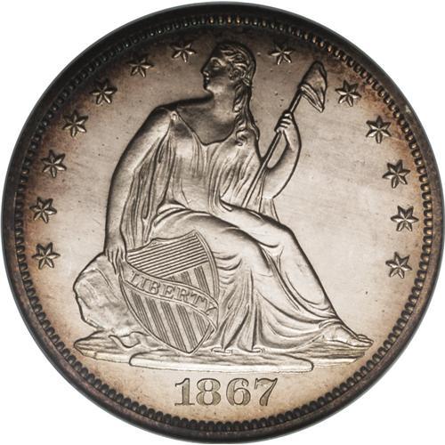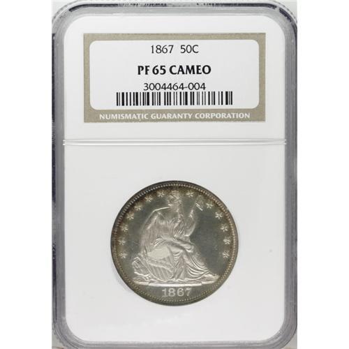 <B>1867 50C PR65 Cameo NGC.</B></I> A nicely mirrored Gem specimen from an original production of just 625 proofs. Watery, virtually untoned centers give way to bits of blue and golden-orange peripheral color. Not only does a low percentage of the already low mintage survive in finer grades, those with sufficient contrast for a cameo designation narrow the field even further. Census: 8 in 65, 4 finer (12/06).<BR><BR><b>Shipping:</b> Coin/Currency (<a target="_blank" href="http://www.heritageauctions.com/common/shipping.php">view shipping information</a>)