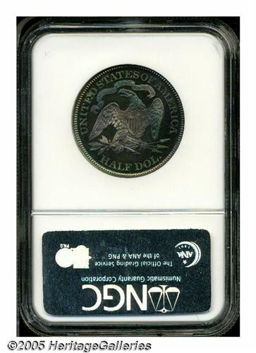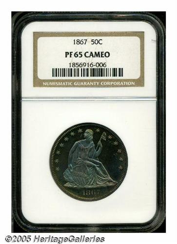 <B>1867<50C> PR65 Cameo NGC.</B></I> Only 625 proof halves were struck in 1867 and high grade examples are especially challenging to locate. NGC has only certified five other Gems with three finer, while PCGS has graded four with two finer (5/05). This is a deeply reflective proof that shows lovely, multicolored toning over each side. The contrast between the fields and devices is apparent even through the multiple layers of color that are present. Fully struck in all areas.