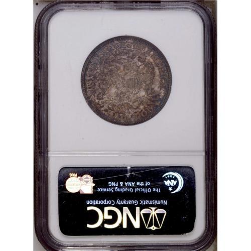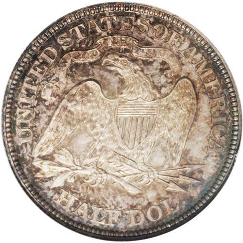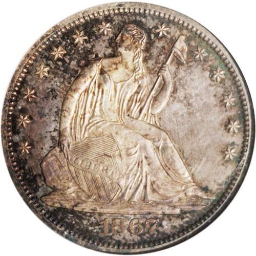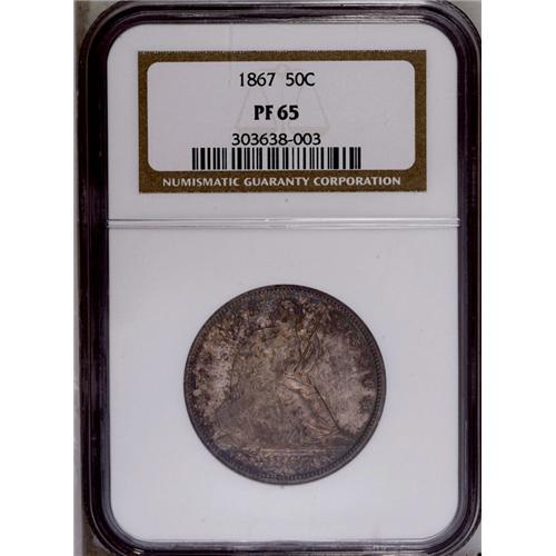 <B>1867<50C> PR65 NGC.</B></I> A needle-sharp Gem that is bathed in sunset-red and antique-gold colors. However, crimson, russet, and cobalt-blue hues appear when the coin is rotated under a light. The fields have faint mint-made striations, but are well preserved, revealing no significant marks. Only 625 pieces were struck, and about 250 coins have been certified by NGC and PCGS, with the vast majority in the PR62 to PR64 grade range. Fewer than 40 specimens have been assigned Gem status, with about 10 examples grading higher. Census: 25 in 65, 6 finer (2/06).