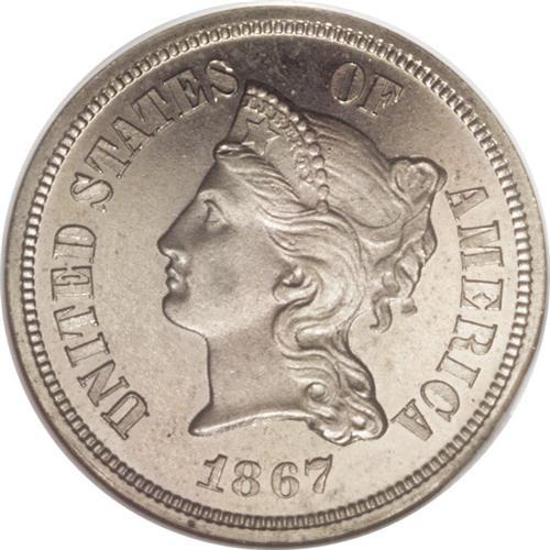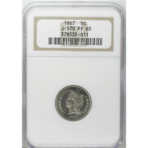 <B>1867 5C Coronet Five Cents, Judd-570, Pollock-638, R.5, PR65 NGC.</B></I> On the obverse, Liberty is wearing a coronet inscribed LIBERTY. Around, the legend UNITED STATES OF AMERICA and below, the date. The reverse has the denomination 5 CENTS enclosed within a laurel wreath, with the motto IN GOD WE TRUST above. Struck in nickel with a plain edge. This example is Obverse 1 in Pollock, with the digit 7 far from the hair curl. Obverse 2 has the digit 7 nearly touching the hair curl, a variety that is substantially rarer, although few collectors examine their patterns for minute die differences.<BR><I>From The Jones Beach Collection.</B></I><BR><BR><b>Shipping:</b> Coin/Currency (<a target="_blank" href="http://www.heritageauctions.com/common/shipping.php">view shipping information</a>)