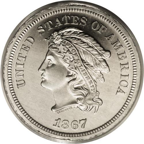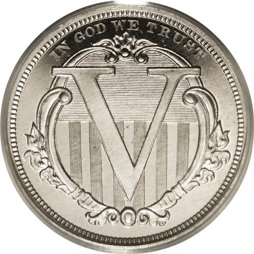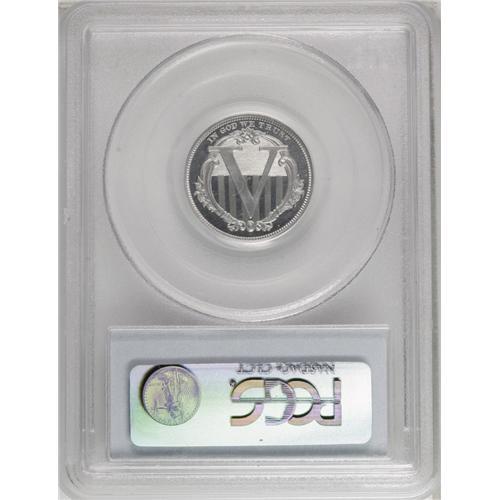 <B>1867<5C> Five Cents, Judd-561, Pollock-622, R.5, PR65 Cameo PCGS.</B></I> Liberty faces left and is adorned with a headdress featuring four feathers and four stars. Liberty's profile greatly resembles the contemporary Indian cent, gold dollar, and three dollar portraits. Chief Engraver Longacre immodestly placed his full surname in small letters beneath the portrait. The reverse depicts an ornate shield with a superimposed large Roman numeral V. Struck in aluminum with a plain edge. A lightly toned and well preserved Gem with detectable frost on the portrait.