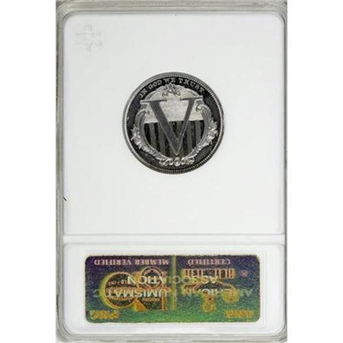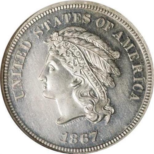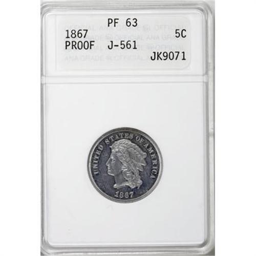 <B>1867 5C Five Cents, Judd-561, Pollock-622, R.5, PR63 ANACS.</B></I> Liberty faces left and is adorned with a headdress featuring four feathers and four stars. Liberty's profile greatly resembles the contemporary Indian cent, gold dollar, and three dollar portraits. Chief Engraver Longacre immodestly placed his full surname in small letters beneath the portrait. The reverse depicts an ornate shield with a superimposed large Roman numeral V. Struck in aluminum with a plain edge. A flashy and precisely struck specimen with delicate chestnut toning. Certified in an ANA cache holder.<BR><BR><b>Shipping:</b> Coins & Currency (<a target="_blank" href="http://www.heritageauctions.com/common/shipping.php">view shipping information</a>)