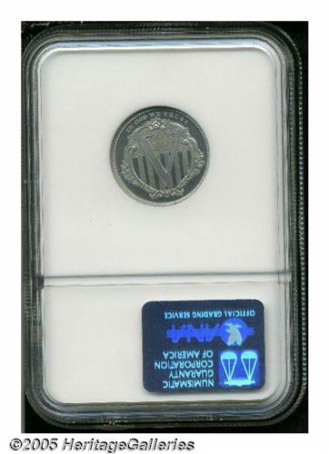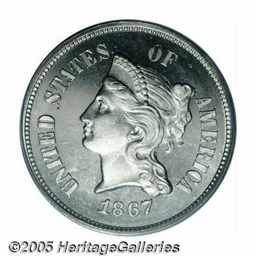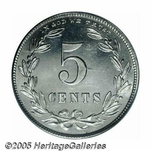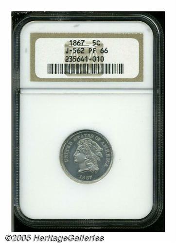 <B>1867<5C> Five Cents, Judd-562, Pollock-623, Low R.7, PR66 NGC.</B></I> An unusual pattern with a bust of Liberty on the obverse facing left. She wears a headdress having four feathers and 4 stars, a ribbon crossing her hair is inscribed UNION & LIBERTY. The engraver's signature LONGACRE F. is present below the truncation. A large V is placed over an ornate shield on the reverse. The motto IN GOD WE TRUST is above. Struck in aluminum with a reeded edge. This wonderfully preserved specimen boasts a problem-free planchet and is coated in delicate oil-slick iridescence.<BR><I>From The Western Hills Collection.</B></I>