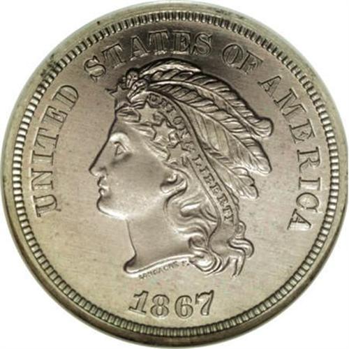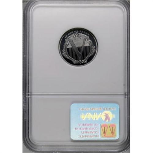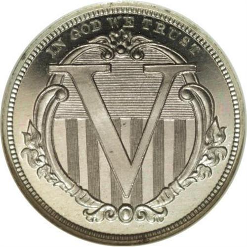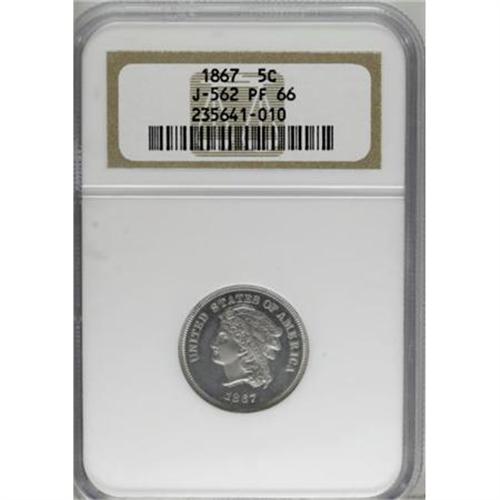 <B>1867 5C Five Cents, Judd-562, Pollock-623, Low R.7, PR66 NGC.</B></I> An unusual pattern with a bust of Liberty on the obverse facing left, wearing a headdress with four feathers and four stars, a ribbon crosses the hair and is inscribed UNION & LIBERTY. The engraver's signature LONGACRE F. is present below the truncation. A large V is placed over an ornate shield on the reverse. The motto IN GOD WE TRUST is above. Struck in aluminum with a reeded edge. About a dozen pieces are known of this pattern in aluminum. This wonderfully preserved specimen boasts a problem-free planchet and is coated in delicate oil-slick iridescence.<BR><BR><BR><b>Shipping:</b> Coins & Currency (<a target="_blank" href="http://www.heritageauctions.com/common/shipping.php">view shipping information</a>)
