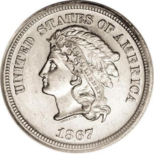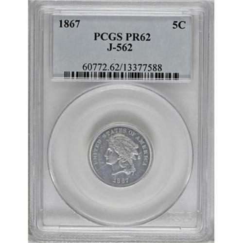 <B>1867 5C Five Cents, Judd-562, Pollock-623, Low R.7, PR62 PCGS.</B></I> An unusual pattern with a bust of Liberty on the obverse facing left, wearing a headdress with four feathers and four stars, a ribbon crosses the hair and is inscribed UNION & LIBERTY. The engraver's signature LONGACRE F. is present below the truncation. A large V is placed over an ornate shield on the reverse. The motto IN GOD WE TRUST is above. Struck in aluminum with a reeded edge. About a dozen examples are known of this aluminum pattern. The surfaces are deeply mirrored with thick mint frost on the devices, which gives the coin a distinct but unacknowledged (on the insert) cameo contrast. Roughly handled in the past, resulting in the PR62 grade.<BR><BR><b>Shipping:</b> Coins & Currency (<a target="_blank" href="http://www.heritageauctions.com/common/shipping.php">view shipping information</a>)