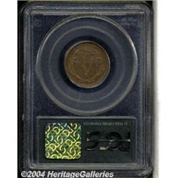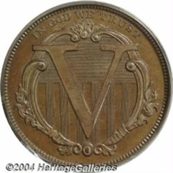 <B>1867<5C> Five Cents, Judd-563, Pollock-624, High R.7, PR64 Brown PCGS.</B></I> James Longacre produced and signed the Indian Head obverse of this pattern issue. The reverse has a large "V" laid over a shield. Struck in copper with a plain edge. This is a very rare pattern issue with only four or five examples known. Pleasing medium tan surfaces with moderately reflective fields and faint iridescent toning. <BR><BR><B>Important notice:</B> Heritage usually auctions material at the rate of 200-250 lots per hour. On some occasions eBay Live bid software or the Internet may not be able to keep up with the pace of the auction. We recommend placing a realistic absentee bid now as insurance to avoid disappointment. Occasionally the auctioneer may eliminate or reject an eBay Live bid, and the auctioneer may also reopen a lot after the close of the eBay live bidding (usually because we missed an audience bid), and may reject your bid even if it shows you as the winning bidder. By bidding via eBay Live, you agree that Heritage may award the lot to another bidder at its sole discretion under the circumstances described above or any other reasonable circumstances. Since eBay bids are not shown to us until we open the lot on the floor, we treat those bids just like floor bids. In most cases the floor responds before the eBay bid is presented to us, due to Internet lag time, so for consistency we have made it a policy that floor bids are always considered first over tie eBay live bids. Also please note that all Heritage lots purchased through eBay Live carry a 20% Buyer's Premium. Please make sure you read the Terms and Conditions before you bid. </span></font></tr></table></td></tr></table>