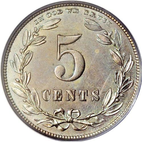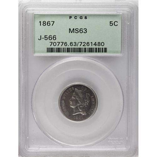 <B>1867 5C Five Cents, Judd-566, Pollock-627, Low R.6, MS63 PCGS.</B></I> The obverse is similar in design to the contemporary Three Cent Nickel although in larger format due to the wider diameter. The reverse features an olive wreath bound by a ribbon, with the denomination at the center and the motto IN GOD WE TRUST from 11 to 1 o'clock. Struck in nickel with a plain edge. An unusual Mint State pattern with light nickel-gray color and hints of rose toning. Slightly weak design details are evident at the centers.<BR><BR><b>Shipping:</b> Coin/Currency (<a target="_blank" href="http://www.heritageauctions.com/common/shipping.php">view shipping information</a>)