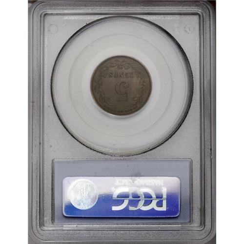 <B>1867<5C> Five Cents, Judd-567, Pollock-628, Low R.7, PR63 Brown PCGS.</B></I> The obverse design is a larger diameter adaptation of the contemporary three cent nickel. The reverse has a prominent Arabic 5 and a sparse peripheral wreath. CENTS and the motto are in small letters. Struck in copper with a plain edge. A pleasing golden-brown example, smooth and sharply struck.