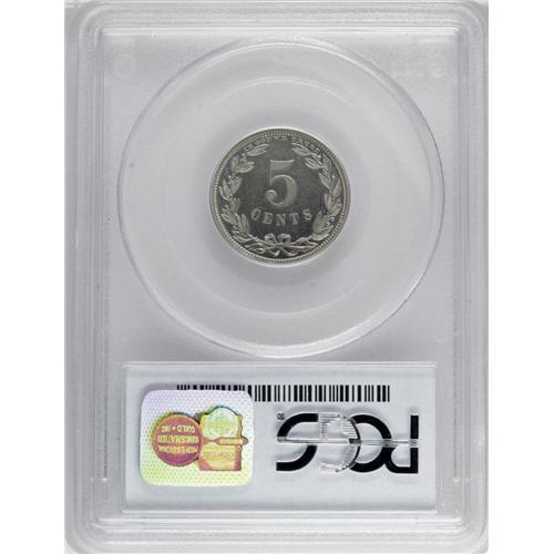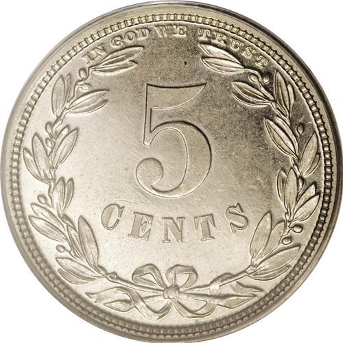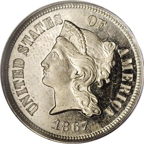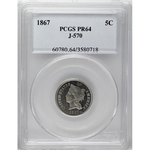<B>1867 5C Five Cents, Judd-570, Pollock-638, 640, R.5, PR64 PCGS.</B></I> The obverse design resembles the contemporary three cent nickel, but in larger scale. The reverse displays the denomination within a laurel wreath. Struck in nickel with a plain edge. A lovely light gray proof with a hint of cameo contrast.<BR><BR><b>Shipping:</b> Coin/Currency (<a target="_blank" href="http://www.heritageauctions.com/common/shipping.php">view shipping information</a>)