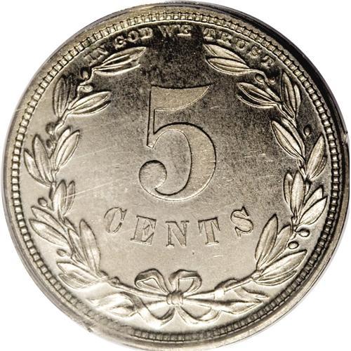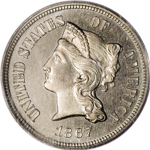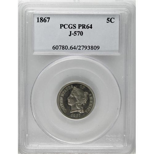 <B>1867 5C Five Cents, Judd-570, Pollock-638, R.5, PR64 PCGS.</B></I> The Coronet Head of Liberty on the obverse with the denomination in a wreath on the reverse. Struck in nickel with a plain edge. Another well preserved representative of this Three Cent Nickel look-alike pattern. Well mirrored surfaces are essentially untoned and close to Gem status.<BR><BR><b>Shipping:</b> Coin/Currency (<a target="_blank" href="http://www.heritageauctions.com/common/shipping.php">view shipping information</a>)