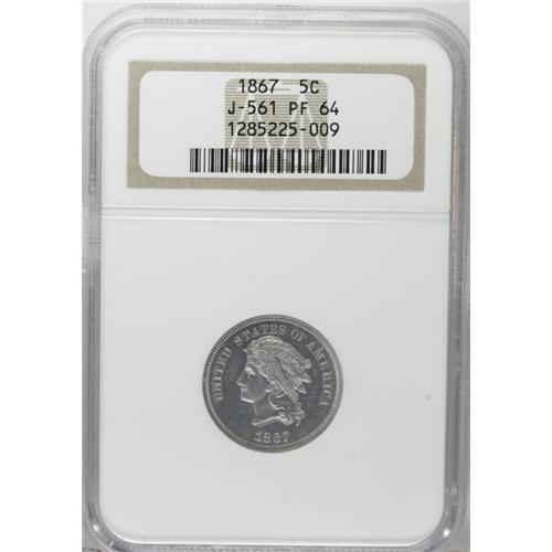 <B>1867 5C Indian Head Five Cents, Judd-561, Pollock-622, R.5, PR64 NGC.</B></I> A Liberty head on the obverse faces left with the legend UNITED STATES OF AMERICA around and the date below. A headdress consists of four feathers and four stars, and a ribbon is inscribed UNION & LIBERTY. Below the bust is LONGACRE F. The reverse has an ornate shield superimposed with a large V. Above, the motto IN GOD WE TRUST. Struck in aluminum with a plain edge. Contemporary information indicates that 100 examples of this pattern variety may have been minted, although others have reported that just 25 were struck. Obviously, with a rarity rating of R.5, the reports of 25 pieces struck are clearly not correct. This example is a lovely piece with deeply mirrored fields and considerable contrast. Both sides have attractive light gray color as usual for pieces made of aluminum.<BR><I>From The Jones Beach Collection.</B></I><BR><BR><b>Shipping:</b> Coin/Currency (<a target="_blank" href="http://www.heritageauctions.com/common/shipping.php">view shipping information</a>)