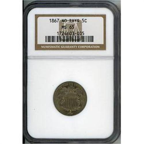 1867 5C NO RAYS NICKEL NGC MS65