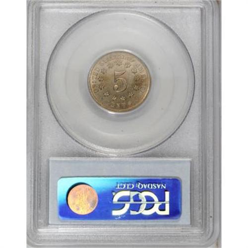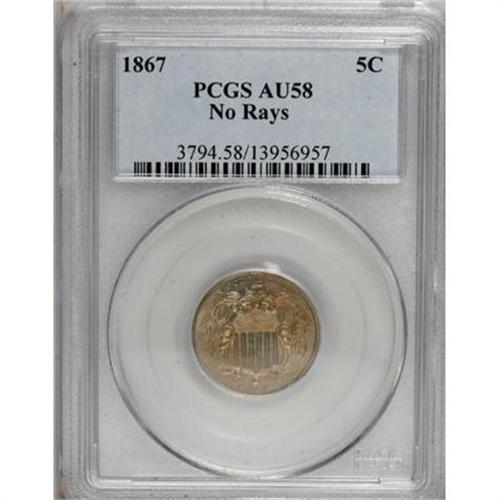 <B>1867 5C No Rays AU58 PCGS.</B></I> PCGS Population (46/501). NGC Census: (31/533). Mintage: 28,800,000. Numismedia Wsl. Price for NGC/PCGS coin in AU58: $67. (#3794)<BR><BR><B>Coin Engraver:</B> James B. Longacre<BR><BR><b>Shipping:</b> Coins & Currency (<a target="_blank" href="http://www.heritageauctions.com/common/shipping.php">view shipping information</a>)