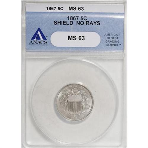 <B>1867 5C No Rays MS63 ANACS.</B></I> NGC Census: (110/356). PCGS Population (146/264). Mintage: 28,800,000. Numismedia Wsl. Price for NGC/PCGS coin in MS63: $152. (#3794)<BR><BR><B>Coin Engraver:</B> James B. Longacre<BR><BR><b>Shipping:</b> Coins & Currency (<a target="_blank" href="http://www.heritageauctions.com/common/shipping.php">view shipping information</a>)