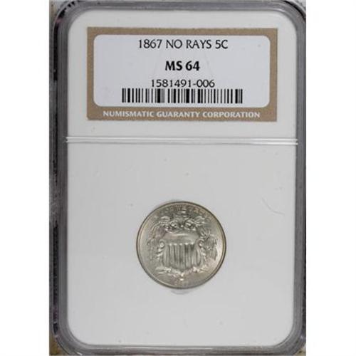 <B>1867 5C No Rays MS64 NGC.</B></I> NGC Census: (221/124). PCGS Population (179/78). Mintage: 28,800,000. Numismedia Wsl. Price for NGC/PCGS coin in MS64: $276. (#3794)<BR><BR><b>Shipping:</b> Coins & Currency (<a target="_blank" href="http://www.heritageauctions.com/common/shipping.php">view shipping information</a>)