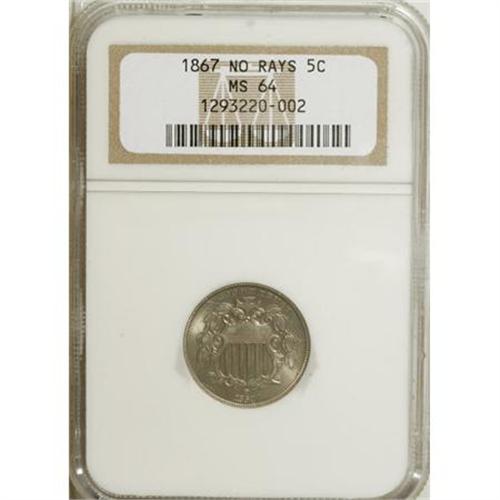 <B>1867 5C No Rays MS64 NGC.</B></I> NGC Census: (221/124). PCGS Population (179/78). Mintage: 28,800,000. Numismedia Wsl. Price for NGC/PCGS coin in MS64: $276. (#3794)<BR><BR><b>Shipping:</b> Coins & Currency (<a target="_blank" href="http://www.heritageauctions.com/common/shipping.php">view shipping information</a>)