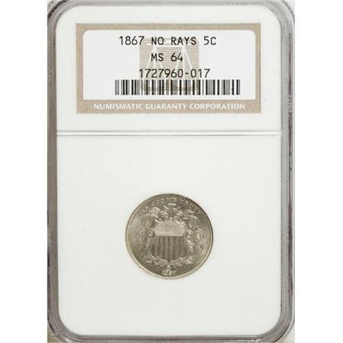 <B>1867 5C No Rays MS64 NGC.</B></I> NGC Census: (230/126). PCGS Population (189/75). Mintage: 28,800,000. Numismedia Wsl. Price for NGC/PCGS coin in MS64: $276. (#3794)<BR><BR><B>Coin Engraver:</B> James B. Longacre<BR><BR><b>Shipping:</b> Coins & Currency (<a target="_blank" href="http://www.heritageauctions.com/common/shipping.php">view shipping information</a>)