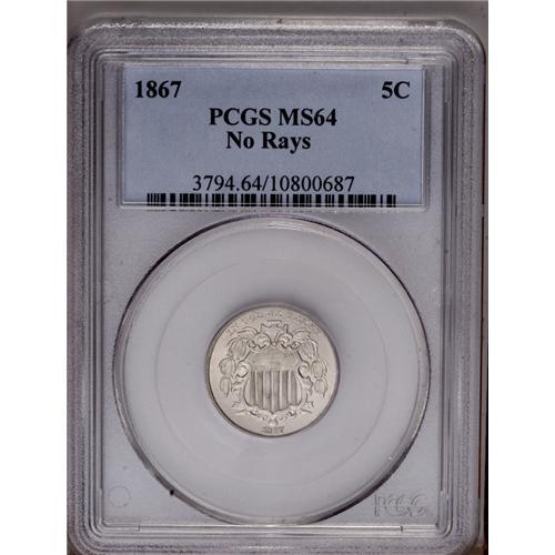 <B>1867<5C> No Rays MS64 PCGS.</B></I> Boldly struck except for some of the central reverse stars, and untoned, with lustrous silver-gray surfaces that are minimally abraded. Wispy striations are noted over the reverse fields. In 1867, it was thought that by removing the rays from the new five cent nickel design the coins would strike up better than they had the previous year. <BR><BR><B>Important notice:</B> Heritage usually auctions material at the rate of 200-250 lots per hour. On some occasions eBay Live bid software or the Internet may not be able to keep up with the pace of the auction. We recommend placing a realistic absentee bid now as insurance to avoid disappointment. Occasionally the auctioneer may eliminate or reject an eBay Live bid, and the auctioneer may also reopen a lot after the close of the eBay live bidding (usually because we missed an audience bid), and may reject your bid even if it shows you as the winning bidder. By bidding via eBay Live, you agree that Heritage may award the lot to another bidder at its sole discretion under the circumstances described above or any other reasonable circumstances. Since eBay bids are not shown to us until we open the lot on the floor, we treat those bids just like floor bids. In most cases the floor responds before the eBay bid is presented to us, due to Internet lag time, so for consistency we have made it a policy that floor bids are always considered first over tie eBay live bids. Also please note that all Heritage lots purchased through eBay Live carry a 20% Buyer's Premium. Please make sure you read the Terms and Conditions before you bid. This lot is being auctioned in conjunction with a live floor auction by Heritage Galleries & Auctioneers. All final auction and invoice information will be supplied by Heritage Galleries & Auctioneers, and all other information should be considered preliminary. Lot:845 <BR><BR><B>Winning Notification and Billing:</B> After the FINAL session in this auction is complete, Heritage will send e-mail and snail mail invoices. This process normally takes several days. All final auction and invoice information will be supplied by Heritage Galleries & Auctioneers, and all other information should be considered preliminary. <BR><BR>This auction will be conducted on a live auction floor and over the Internet through eBay Live. If you choose to place an absentee bid, please take a moment to <font color='#0000ff'><u><a href='http://pages.ebay.com/liveauctions/help/before/laabsentee.html'>learn how eBay Live absentee bidding works</a></u></font><font color='#000000'>