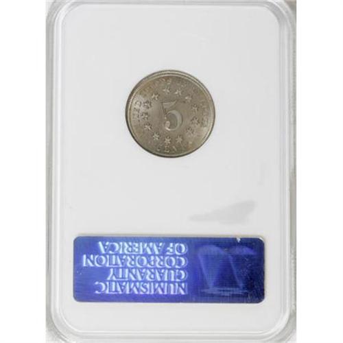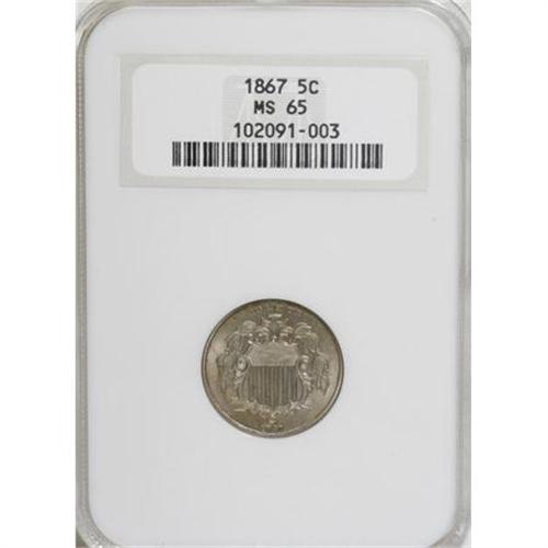 <B>1867 5C No Rays MS65 NGC.</B></I> During its early years, the Shield nickel was plagued with production problems, due at least partly to the hardness of the metal. This can be illustrated on the current example by reference to the spindly die cracks that are noticeable on the obverse. Lustrous and well preserved, this is still an attractive and conditionally scarce Gem example. Census: 96 in 65, 28 finer (6/07). <BR><BR><b>Shipping:</b> Coins & Currency (<a target="_blank" href="http://www.heritageauctions.com/common/shipping.php">view shipping information</a>)