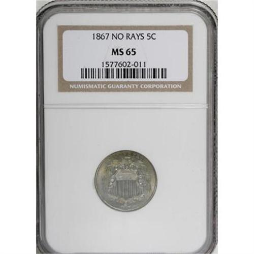 <B>1867 5C No Rays MS65 NGC.</B></I> Light gold-orange and ice-blue color rests on highly lustrous surfaces that reveal just a few light reverse flecks. Well struck throughout. Census: 98 in 65, 28 finer (12/07).<BR><BR><B>Coin Engraver:</B> James B. Longacre<BR><BR><b>Shipping:</b> Coins & Currency (<a target="_blank" href="http://www.heritageauctions.com/common/shipping.php">view shipping information</a>)