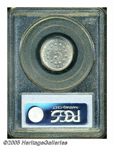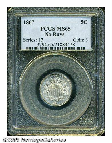 <B>1867<5C> No Rays MS65 PCGS.</B></I> Highly lustrous nickel-gray surfaces display a touch or two of milky-tan patina, and are immaculately well preserved. The design features are adequately struck, though some weakness is apparent in the horizontal and vertical stripes of the shield. Population: 58 in 65, 8 finer (3/05).