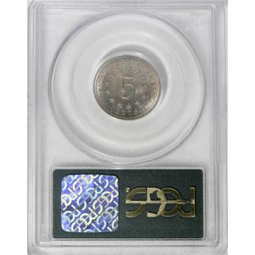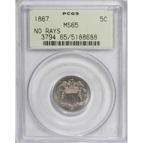 <B>1867 5C No Rays MS65 PCGS.</B></I> This is a lovely, lustrous Gem Shield nickel from the second year of the series; and the first year of the No Rays type. Generally well detailed except for minor softness on the shield's vertical stripes. Bright, essentially untoned, and free of distracting marks. A few spidery die cracks are observed on the obverse. Population: 69 in 65, 9 finer (6/07). <BR><BR><b>Shipping:</b> Coins & Currency (<a target="_blank" href="http://www.heritageauctions.com/common/shipping.php">view shipping information</a>)
