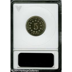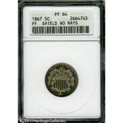 1867 5C No Rays PR64 ANACS. Lightly toned, with ex <B>1867 5C No Rays PR64 ANACS.</B></I> Lightly toned, with exquisitely impressed motifs. A few inconspicuous marks are seen within the horizontal shield lines. <BR><BR><B>Important notice:</B> Heritage usually auctions material at the rate of 200-250 lots per hour. On some occasions eBay Live bid software or the Internet may not be able to keep up with the pace of the auction. We recommend placing a realistic absentee bid now as insurance to avoid disappointment. Occasionally the auctioneer may eliminate or reject an eBay Live bid, and the auctioneer may also reopen a lot after the close of the eBay live bidding (usually because we missed an audience bid), and may reject your bid even if it shows you as the winning bidder. By bidding via eBay Live, you agree that Heritage may award the lot to another bidder at its sole discretion under the circumstances described above or any other reasonable circumstances. Since eBay bids are not shown to us until we open the lot on the floor, we treat those bids just like floor bids. In most cases the floor responds before the eBay bid is presented to us, due to Internet lag time, so for consistency we have made it a policy that floor bids are always considered first over tie eBay live bids. Also please note that all Heritage lots purchased through eBay Live carry a 20% Buyer's Premium. Please make sure you read the Terms and Conditions before you bid. This lot is being auctioned in conjunction with a live floor auction by Heritage Galleries & Auctioneers. All final auction and invoice information will be supplied by Heritage Galleries & Auctioneers, and all other information should be considered preliminary. Lot:5509