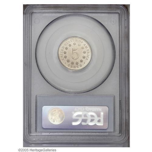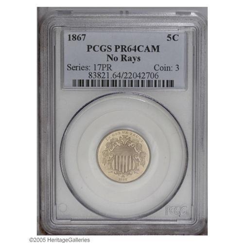 <B>1867<5C> No Rays PR64 Cameo PCGS.</B></I> Reverse IIa. Only faintly toned in apricot hues, this lovely near-Gem is technically well preserved but has minor softness of strike and a retained lamination (as made) near 10 o'clock on the obverse. A scarce proof issue.