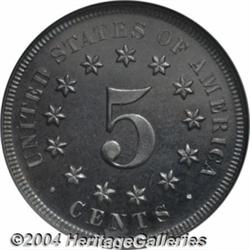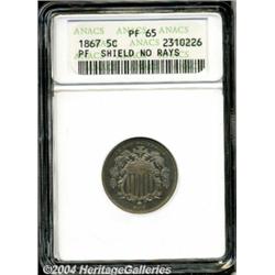 <B>1867<5C> No Rays PR65 ANACS.</B></I> Only 600 proofs were reportedly struck of this second year of issue, and first year of the modified design. While this coin presents as brilliant, close examination reveals just the slightest trace of patina on each side. The fields are deeply mirrored and the obverse devices display a noticeable amount of frost against the unfathomable glassiness in the fields. A star points between AM in AMERICA on this proof subtype. A carefully preserved Gem with a most pleasant appearance. <BR><BR><B>Important notice:</B> Heritage usually auctions material at the rate of 200-250 lots per hour. On some occasions eBay Live bid software or the Internet may not be able to keep up with the pace of the auction. We recommend placing a realistic absentee bid now as insurance to avoid disappointment. Occasionally the auctioneer may eliminate or reject an eBay Live bid, and the auctioneer may also reopen a lot after the close of the eBay live bidding (usually because we missed an audience bid), and may reject your bid even if it shows you as the winning bidder. By bidding via eBay Live, you agree that Heritage may award the lot to another bidder at its sole discretion under the circumstances described above or any other reasonable circumstances. Since eBay bids are not shown to us until we open the lot on the floor, we treat those bids just like floor bids. In most cases the floor responds before the eBay bid is presented to us, due to Internet lag time, so for consistency we have made it a policy that floor bids are always considered first over tie eBay live bids. Also please note that all Heritage lots purchased through eBay Live carry a 20% Buyer's Premium. Please make sure you read the Terms and Conditions before you bid. </span></font></tr></table></td></tr></table>