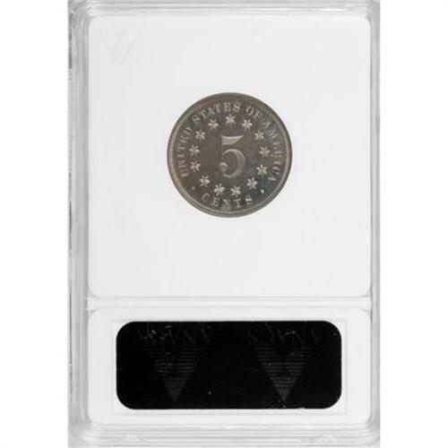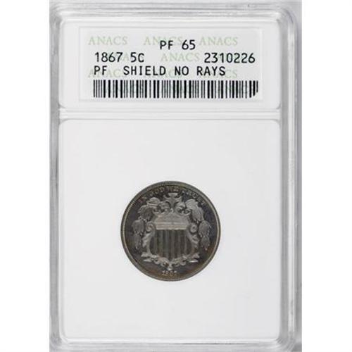 <B>1867 5C No Rays PR65 ANACS.</B></I> Only 600 proofs were reportedly struck of this second year of issue, and first year of the modified design. While this coin presents as brilliant, close examination reveals just the slightest trace of patina on each side. The fields are deeply mirrored and the obverse devices display a noticeable amount of frost against the unfathomable glassiness in the fields. A star points between AM in AMERICA on this proof subtype. A carefully preserved Gem with a very pleasing appearance.<BR><BR><B>Coin Engraver:</B> James B. Longacre<BR><BR><b>Shipping:</b> Coins & Currency (<a target="_blank" href="http://www.heritageauctions.com/common/shipping.php">view shipping information</a>)