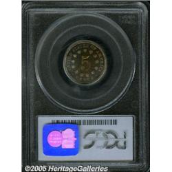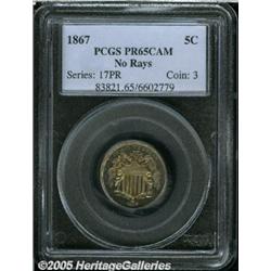 <B>1867 5C No Rays PR65 Cameo PCGS.</B></I> Second year of issue for the Shield Nickel, the design was modified in 1867 by eliminating the rays on the reverse in order to facilitate better striking. Brilliant throughout with hints of streaky red color, the fields show great depth of mirrored reflectivity and the devices have a noticeable portion of mint frost which gives the coin a noticeable cameo contrast. A small lintmark (as struck) is seen above the 5 on the reverse. Population: 18 in 65, 6 finer (2/05).