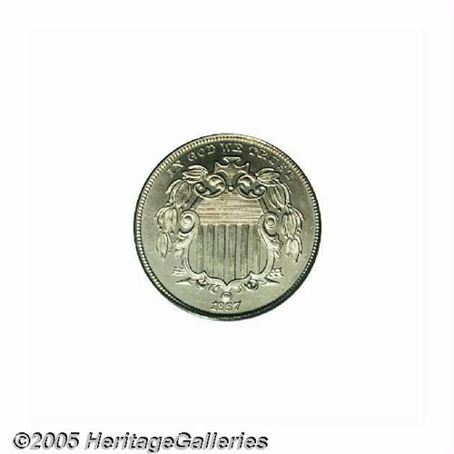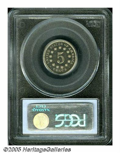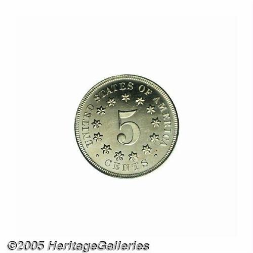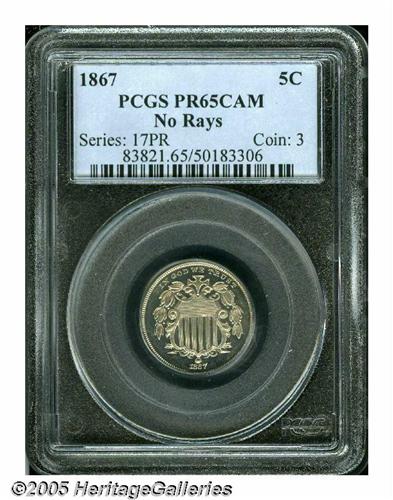 <B>1867<5C> No Rays PR65 Cameo PCGS.</B></I> Second year of issue for the Shield Nickel, the design being modified midway through the year in order to facilitate better striking and less stress on the dies. Brilliant throughout, the fields show excellent depth of mirrored reflectivity and the devices have at least a modest portion of mint frost. Population: 19 in 65 Cameo, 6 finer (6/05).
