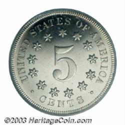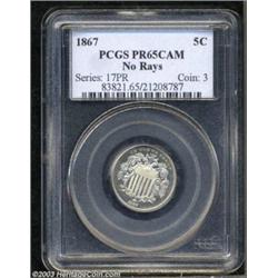 <table><tr><td><TABLE cellSpacing=0 cellPadding=0 width="100%" bgColor=#000000 border=0><TBODY> <TR><TD width="100%"><TABLE cellSpacing=1 cellPadding=3 width="100%" border=0><TBODY><TR><TD width="100%" bgColor=#79735c><FONT face=arial color=#ffffff size=3><B>Description</B> </FONT></TD></TR><TR><TD width="100%" bgColor=#ffffff><FONT face=arial size=2><B>1867 5C No Rays PR65 Cameo PCGS.</B></I> Although more common than its counterpart, the so-called "Rays" variety, the proof 1867 No Rays Nickel is a conditionally challenging issue that is seldom seen with any degree of Cameo contrast. This is one of the finest coins extant, the surfaces displaying a lightly patinated, olive-gray sheen. The well struck and richly frosted devices contrast attractively against the watery, reflective fields. There are a few scattered, barely-visible contact marks, and a very faint die crack (as struck) lies over the obverse shield. NGC and PCGS combined have certified just ten coins in the PR65 Cameo grade. Population: 7 in 65 Cameo, 1 finer (9/03). </FONT></TD></TR></TBODY></TABLE></TD></TR></TBODY></TABLE><BR><A name=PricesRealized></A><TABLE cellSpacing=0 cellPadding=0 width="100%" bgColor=#000000 border=0><TBODY><TR><TD width="100%"><TABLE cellSpacing=1 cellPadding=3 width="100%" border=0><TBODY><TR><TD width="100%" bgColor=#79735c><A name=PR><FONT face=arial color=#ffffff size=3><B>Previous Prices from Heritage Auctions</B> </FONT></A></TD></TR><TR><TD bgColor=#f6f6ed><TABLE cellSpacing=0 cellPadding=0 width="100%" border=1><TBODY><TR><TD align=middle width="33%"><B>Date</B></TD><TD align=middle width="33%"><B>Service</B></TD><TD align=middle width="33%"><B>Price</B></TD></TR><TR bgColor=whitesmoke><TD width="33%"><B>08/06/2002</B></TD><TD width="33%">PCGS</TD><TD width="33%">$3,795.00</TD></TR><TR bgColor=whitesmoke><TD width="33%"><B>01/11/2003</B></TD><TD width="33%">PCGS</TD><TD width="33%">$2,530.00</TD></TR><TR bgColor=whitesmoke><TD width="33%"><B>04/27/2002</B></TD><TD width="33%">NGC</TD><TD width="33%">$2,127.50</TD></TR><TR bgColor=whitesmoke><TD width="33%"><B>01/13/2002</B></TD><TD width="33%">NGC</TD><TD width="33%">$2,300.00</TD></TR></TBODY></TABLE></TD></TR><TR><TD bgColor=#ffffff><FONT face=arial size=1 ?>PLEASE NOTE: All prices realized reflect the final hammer price PLUS the buyer's premium in auctions that charge a buyer's premium. Each item has a notation at the top of the listing indicating whether that lot included a buyer's premium. Example: A item that sells with a final hammer price of $100 and a 20% buyer's premium will display with a price realized of $120. All information listed is intended to be as accurate as possible, but errors are possible. Please use this guide carefully and inform us of any inaccuracies. </FONT></TD></TR></TBODY></TABLE></TD></TR></TBODY></TABLE><BR><TABLE cellSpacing=0 cellPadding=0 width="100%" bgColor=#000000 border=0><TBODY><TR><TD width="100%"><TABLE cellSpacing=1 cellPadding=3 width="100%" border=0><TBODY><TR><TD width="100%" bgColor=#79735c colSpan=6><FONT face=arial color=#ffffff size=3><B>Price Guide*</B> </FONT></TD></TR><TR bgColor=#f6f6ed><TD align=middle><B>Grade</B> </TD><TD align=middle><B>Coin World<BR>(Trends)</B> </TD><TD align=middle><B>Numismedia<BR>Retail</B> </TD><TD align=middle><B>Numismedia<BR>Wholesale</B> </TD><TD align=middle><B>Coin<BR>Universe</B> </TD><TD align=middle><B>Heritage<BR>Value Index</B> </TD></TR><TR bgColor=#ffffff><TD align=middle>64</TD><TD align=right>---</TD><TD align=right>---</TD><TD align=right>---</TD><TD align=right>---</TD><TD align=right>$611.25</TD></TR><TR style="FONT-WEIGHT: bold" bgColor=#cccfdd><TD align=middle>65</TD><TD align=right>---</TD><TD align=right>---</TD><TD align=right>---</TD><TD align=right>---</TD><TD align=right>$2,580.00</TD></TR><TR bgColor=#ffffff><TD align=middle>66</TD><TD align=right>---</TD><TD align=right>---</TD><TD align=right>---</TD><TD align=right>---</TD><TD align=right>---</TD></TR><TR bgColor=#ffffff><TD colSpan=6><FONT size=1>*All information listed is intended to be as accurate as possible, but errors are possible. No item may be returned or refused based on this information which is provided as a service to our customers. You should contact each pricing source directly to determine the accuracy of this information. </FONT></TD></TR></TBODY></TABLE></TD></TR></TBODY></TABLE><BR><TABLE cellSpacing=0 cellPadding=0 width="100%" bgColor=#000000 border=0><TBODY><TR><TD width="100%"><TABLE cellSpacing=1 cellPadding=3 width="100%" border=0><TBODY><TR><TD width="100%" bgColor=#79735c><FONT face=arial color=#ffffff size=3><B>Population Guide</B> </FONT></TD></TR><TR bgColor=#ffffff><TD align=middle><!-- Begin Output of Population Grid--><TABLE cellSpacing=0 cellPadding=0 width="100%" border=0><TBODY><TR><TD vAlign=center><TABLE cellSpacing=0 width="100%" border=1 cellsadding="3"><TBODY><TR><TD vAlign=center><TABLE cellSpacing=0 cellPadding=3 width="100%" border=1><TBODY><TR><TD vAlign=center align=middle bgColor=#f0f1e8 colSpan=2 <CENTER><FONT face=Arial size=2><B>PCGS Pop </B></FONT><CENTER></CENTER></TD><TD vAlign=center align=middle bgColor=#f0f1e8 colSpan=2><CENTER><FONT face=Arial size=2><B>NGC Pop</B></CENTER></FONT></TD></TR><TR><TD vAlign=center><FONT face=Arial size=2>(65)</FONT> </TD><TD vAlign=center align=right><FONT face=Arial size=2>16</FONT> </TD><TD vAlign=center><FONT face=Arial size=2>(65)</FONT> </TD><TD vAlign=center align=right><FONT face=Arial size=2>3</FONT> </TD></TR><TR><TD vAlign=center><FONT face=Arial size=2>(>65)</FONT> </TD><TD vAlign=center align=right><FONT face=Arial size=2>3</FONT> </TD><TD vAlign=center><FONT face=Arial size=2>(>65)</FONT> </TD><TD vAlign=center align=right><FONT face=Arial size=2>3</FONT> </TD></TR></TBODY></TABLE></TD></TR></TBODY></TABLE></TD></TR></TBODY></TABLE><!-- End Output of Population Grid--></TD></TR></TBODY></TABLE></TD></TR></TBODY></TABLE><BR><TABLE cellSpacing=0 cellPadding=0 width="100%" bgColor=#00