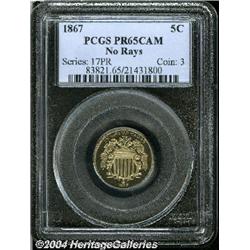 <B>1867<5C> No Rays PR65 Cameo PCGS.</B></I> If you've been looking for an attractive, high-quality No Rays Shield nickel for your type set, why not consider this Gem? This is a transitional issue and represents the first year of this modified design. The fields are deeply mirrored beneath pale champagne and rose toning with excellent Cameo contrast, especially on the obverse. The obverse has a minor planchet blemish at O of GOD, as struck. The <I>Guide Book</B></I> lists a mintage of "600+" based on a distribution of 625 silver proof sets and an additional unknown quantity of minor proof sets and single coins. <BR><BR><B>Important notice:</B> Heritage usually auctions material at the rate of 200-250 lots per hour. On some occasions eBay Live bid software or the Internet may not be able to keep up with the pace of the auction. We recommend placing a realistic absentee bid now as insurance to avoid disappointment. Occasionally the auctioneer may eliminate or reject an eBay Live bid, and the auctioneer may also reopen a lot after the close of the eBay live bidding (usually because we missed an audience bid), and may reject your bid even if it shows you as the winning bidder. By bidding via eBay Live, you agree that Heritage may award the lot to another bidder at its sole discretion under the circumstances described above or any other reasonable circumstances. Since eBay bids are not shown to us until we open the lot on the floor, we treat those bids just like floor bids. In most cases the floor responds before the eBay bid is presented to us, due to Internet lag time, so for consistency we have made it a policy that floor bids are always considered first over tie eBay live bids. Also please note that all Heritage lots purchased through eBay Live carry a 20% Buyer's Premium. Please make sure you read the Terms and Conditions before you bid.