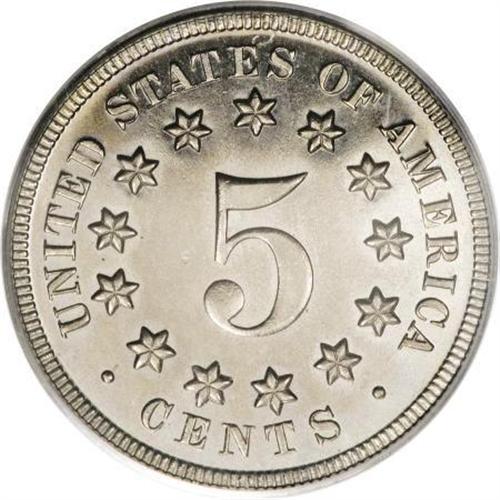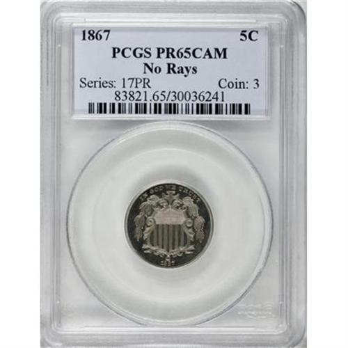 <B>1867 5C No Rays PR65 Cameo PCGS.</B></I> The gleaming mirrors show a touch more glassy reflectivity on the obverse. A gorgeous Gem with subtle nickel-blue and pink shadings over each side. The 1867 No Rays is one of the less frequently encountered proofs in the series, and attractive examples with appreciable contrast are particularly elusive. PCGS has graded only seven finer Cameo coins (3/08).<BR><BR><b>Shipping:</b> Coins & Currency (<a target="_blank" href="http://www.heritageauctions.com/common/shipping.php">view shipping information</a>)