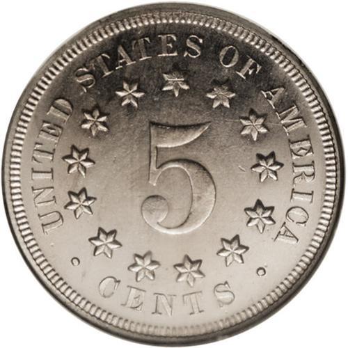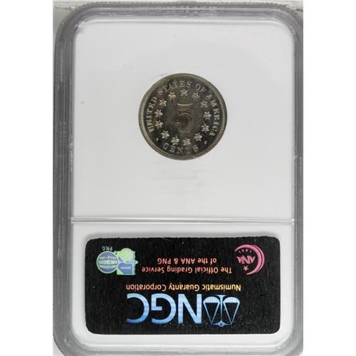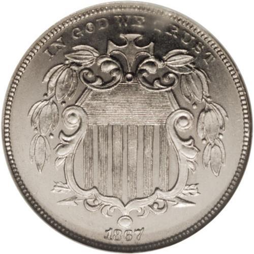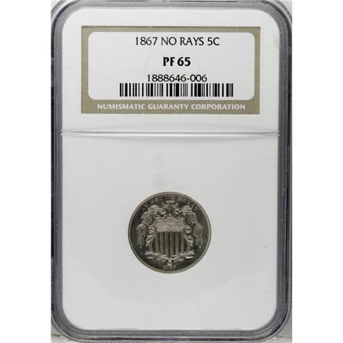 <B>1867 5C No Rays PR65 NGC.</B></I> A Gem striking of this popular type coin, produced after the chief coiner at the Mint refused to strike more pieces with the crowded With Rays design, making the 1867 With Rays a classic rarity. Many series specialists are unaware that two reverses exist for this issue, the present coin being the one with a star centered beneath AM, the more common Reverse Style D (according to the Bowers <I>Guide Book of Shield and Liberty Nickels).</B></I> The rarer Reverse Style C shows a star centered beneath the first A in AMERICA. This silver-white coin shows light field haze on the reverse, but is still quite attractive, with near-cameo contrast. Census: 42 in 65, 9 finer (12/06).<BR><BR><b>Shipping:</b> Coin/Currency (<a target="_blank" href="http://www.heritageauctions.com/common/shipping.php">view shipping information</a>)
