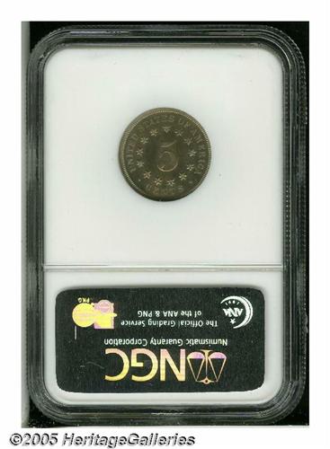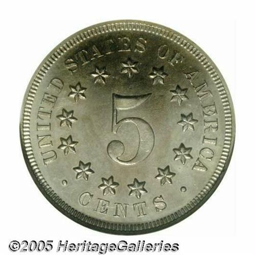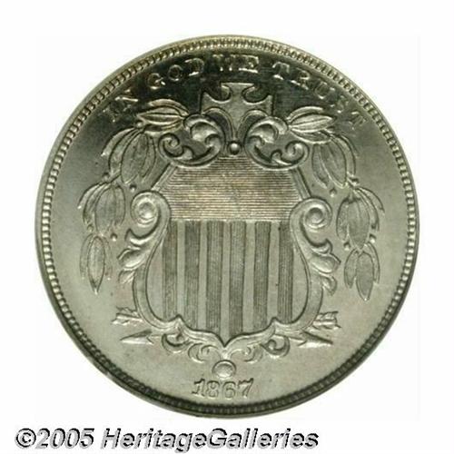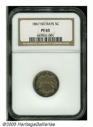 <B>1867<5C> No Rays PR65 NGC.</B></I> Only 600 proofs were reportedly struck of this second year of issue, and first year of the modified design. While this coin presents as mostly brilliant, further examination reveals a light accumulation of orange-peach patina on each side. The fields are moderately mirrored, an often-seen characteristic of this issue. A star points between AM in AMERICA on this proof subtype. A carefully preserved Gem with a most pleasant appearance. Population: 40 in 65, 9 finer (4/05).