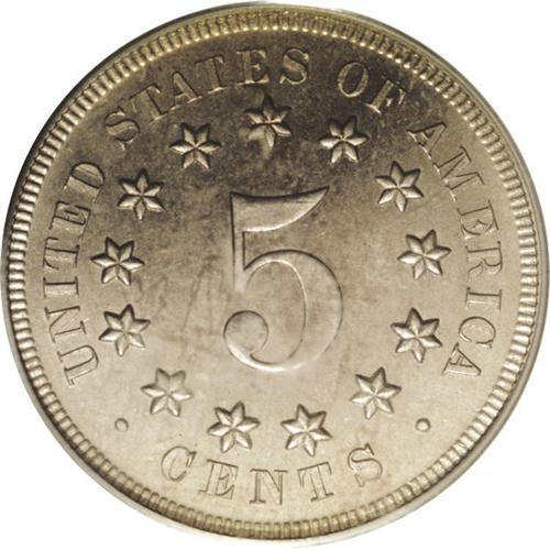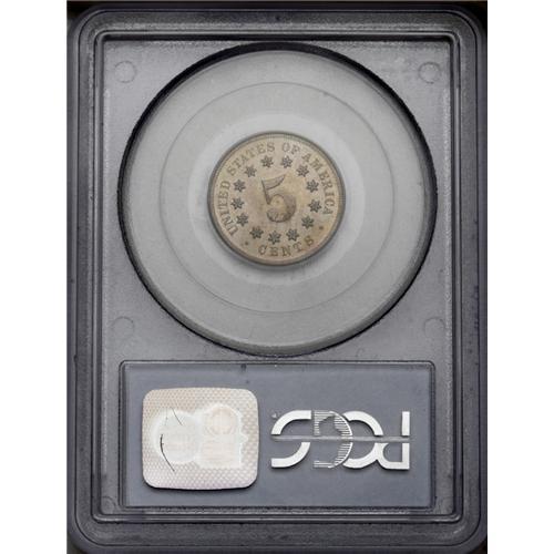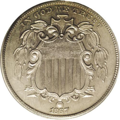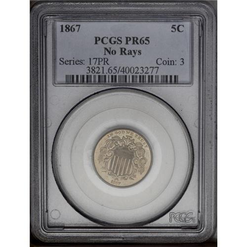 <B>1867<5C> No Rays PR65 PCGS.</B></I> Reverse IIa. Second year of issue and the first year this design was struck without the rays on the reverse. This is a moderately reflective coin that has even golden toning over both sides. A distraction-free, solidly graded Gem example. Population: 31 in 65, 7 finer (8/05). <BR><BR><B>Important notice:</B> Heritage usually auctions material at the rate of 200-250 lots per hour. On some occasions eBay Live bid software or the Internet may not be able to keep up with the pace of the auction. We recommend placing a realistic absentee bid now as insurance to avoid disappointment. Occasionally the auctioneer may eliminate or reject an eBay Live bid, and the auctioneer may also reopen a lot after the close of the eBay live bidding (usually because we missed an audience bid), and may reject your bid even if it shows you as the winning bidder. By bidding via eBay Live, you agree that Heritage may award the lot to another bidder at its sole discretion under the circumstances described above or any other reasonable circumstances. Since eBay bids are not shown to us until we open the lot on the floor, we treat those bids just like floor bids. In most cases the floor responds before the eBay bid is presented to us, due to Internet lag time, so for consistency we have made it a policy that floor bids are always considered first over tie eBay live bids. Also please note that all Heritage lots purchased through eBay Live carry a 20% Buyer's Premium. Please make sure you read the Terms and Conditions before you bid. This lot is being auctioned in conjunction with a live floor auction by Heritage Galleries & Auctioneers. All final auction and invoice information will be supplied by Heritage Galleries & Auctioneers, and all other information should be considered preliminary. Lot:877 <BR><BR><B>Winning Notification and Billing:</B> After the FINAL session in this auction is complete, Heritage will send e-mail and snail mail invoices. This process normally takes several days. All final auction and invoice information will be supplied by Heritage Galleries & Auctioneers, and all other information should be considered preliminary. <BR><BR>This auction will be conducted on a live auction floor and over the Internet through eBay Live. If you choose to place an absentee bid, please take a moment to <font color='#0000ff'><u><a href='http://pages.ebay.com/liveauctions/help/before/laabsentee.html'>learn how eBay Live absentee bidding works</a></u></font><font color='#000000'>